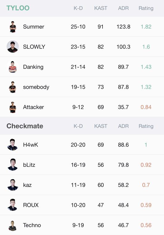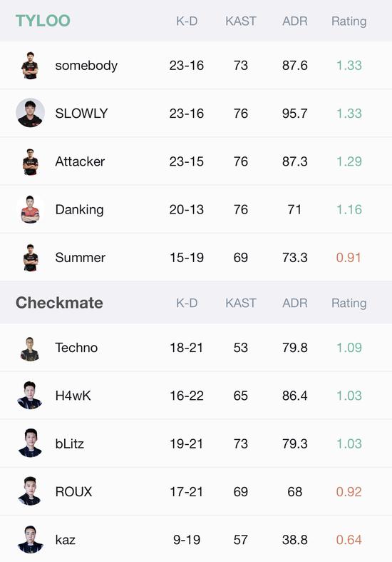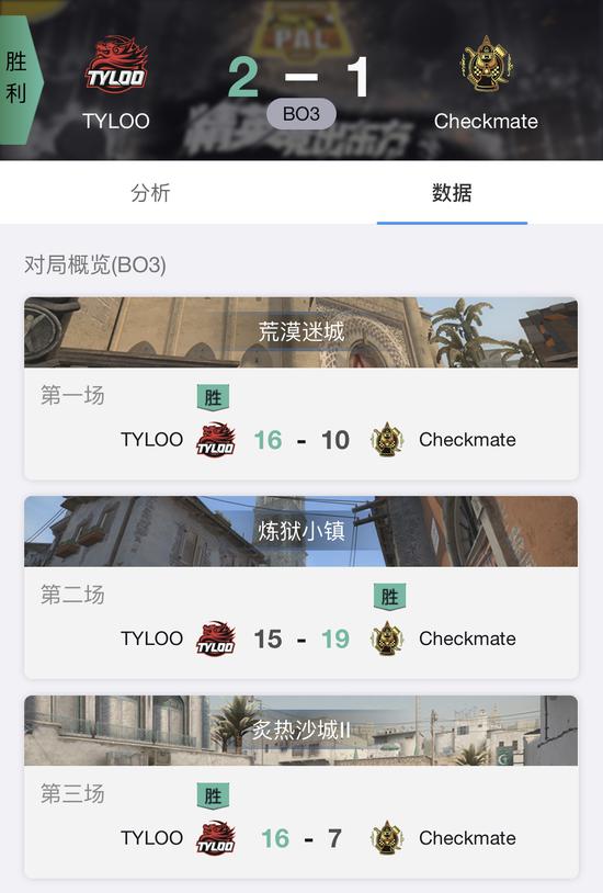 TYLOO对阵Checkmate 图一Mirage,防守方开局的TYLOO先下四城随后被Checkmate反超,半场比分锁定在TYLOO8:7Checkmate。下半场双方你追我赶,但TYLOO在第22局找到了进攻节奏,以16:10赢得图一胜利。